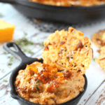 And just note that even though I am calling this dip "hot", it is not too spicy hot, but instead refers to the hot temperature. The dip is served and kept warm (thanks to using a cast iron skillet!) to keep all the cheese nice and gooey. I always serve this dip with a bottle of Frank's Hot Sauce or other hot sauce so that your guests can customize the level of spice to their liking.